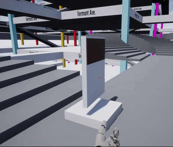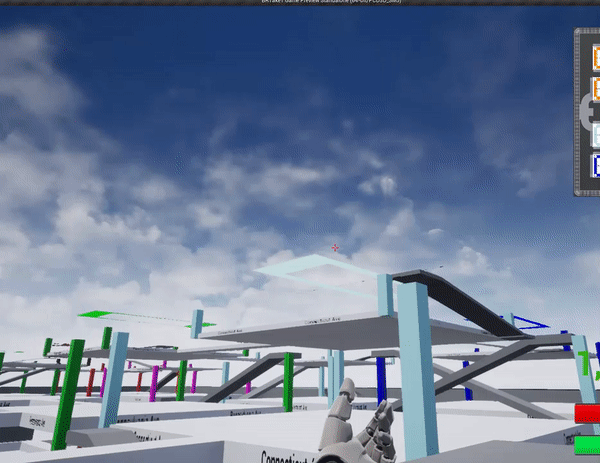 This is what the map I made ended up looking like. Properties scattered around a board, a railway encircling the play space to allow for fast travel around the map. The property locations are randomly placed each play session allowing for interesting and varied routes every game. There is also a platform in the middle I will explain further down the line. Bridges between properties are generated randomly, in addition to elevators, and community chests that function as shops.